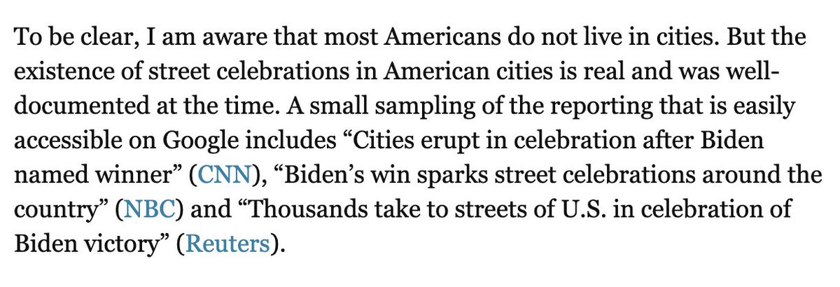 The statement is part of a conversation regarding the extent and nature of public celebrations following the announcement of Joe Biden's victory in the 2020 U.S. presidential election. The tone of the conversation is argumentative, with different parties disputing the characterization of the events. The content includes references to various news reports to support the claim of widespread celebrations.