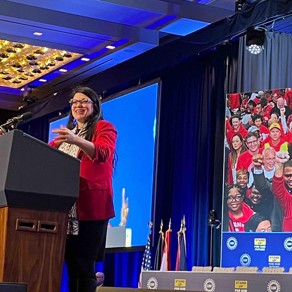 The statement by Congresswoman Rashida Tlaib encourages collective action and emphasizes the power of workers in driving transformative change. It suggests that significant societal shifts are not solely the responsibility of elected officials but also of the general populace. The tone is empowering and inclusive, and the content promotes civic engagement and solidarity with the United Auto Workers (UAW) union.