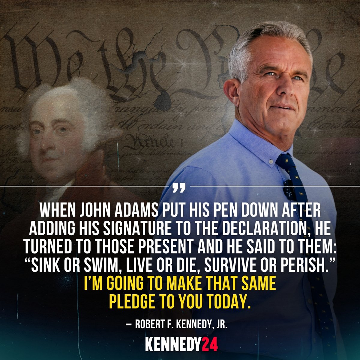 The image contains a quote attributed to Robert F. Kennedy Jr., referencing a historical moment involving John Adams and the signing of the Declaration of Independence. The statement is a pledge of commitment and determination, drawing a parallel between the speaker's intentions and the resolve of the founding fathers. The tone is serious and motivational, and the content is political in nature. It is part of a campaign (as indicated by 'KENNEDY24') and is likely meant to inspire or rally support.