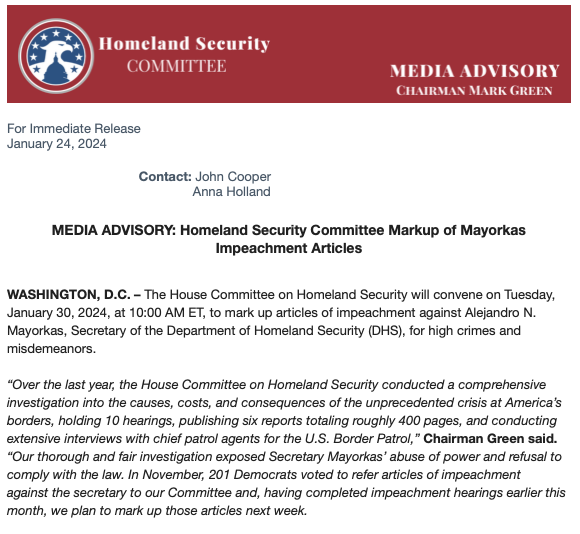 The statement is a part of public discourse as it addresses a significant political action, namely the impeachment of a public official, which is a matter of public concern and policy. The statement criticizes the current administration's handling of border security and announces a legislative committee's intention to take action by impeaching the Secretary of Homeland Security. It implies a failure to enforce laws and suggests that this has led to a crisis.