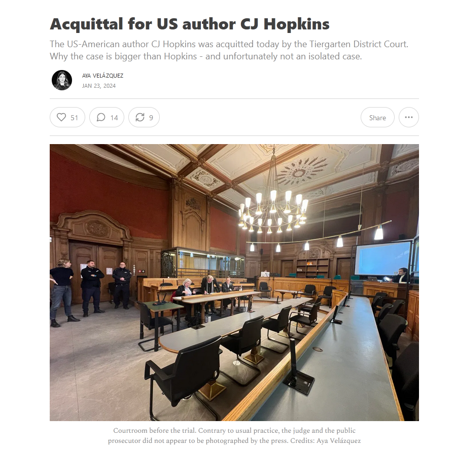 The statement 'Congratulations CJ!' is a simple expression of goodwill and support towards CJ Hopkins following his acquittal. It is a positive and respectful acknowledgment of what appears to be a significant personal and legal victory for CJ Hopkins. The tone is congratulatory and does not contain any harmful, disrespectful, or divisive language.