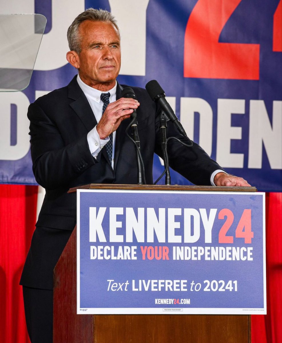 The statement 'Not bad for a guy who’s been slandered and censored by MSM for the last decade! 🇺🇸 #Kennedy24' appears to be a supportive comment towards a political figure, suggesting that despite negative treatment by mainstream media, the individual has achieved a favorable position. The tone is somewhat combative but celebratory, and it implies a critique of the media's treatment of the individual. The images provided show a man at a podium with campaign branding and a poll result graphic indicating favorability ratings of various political figures.