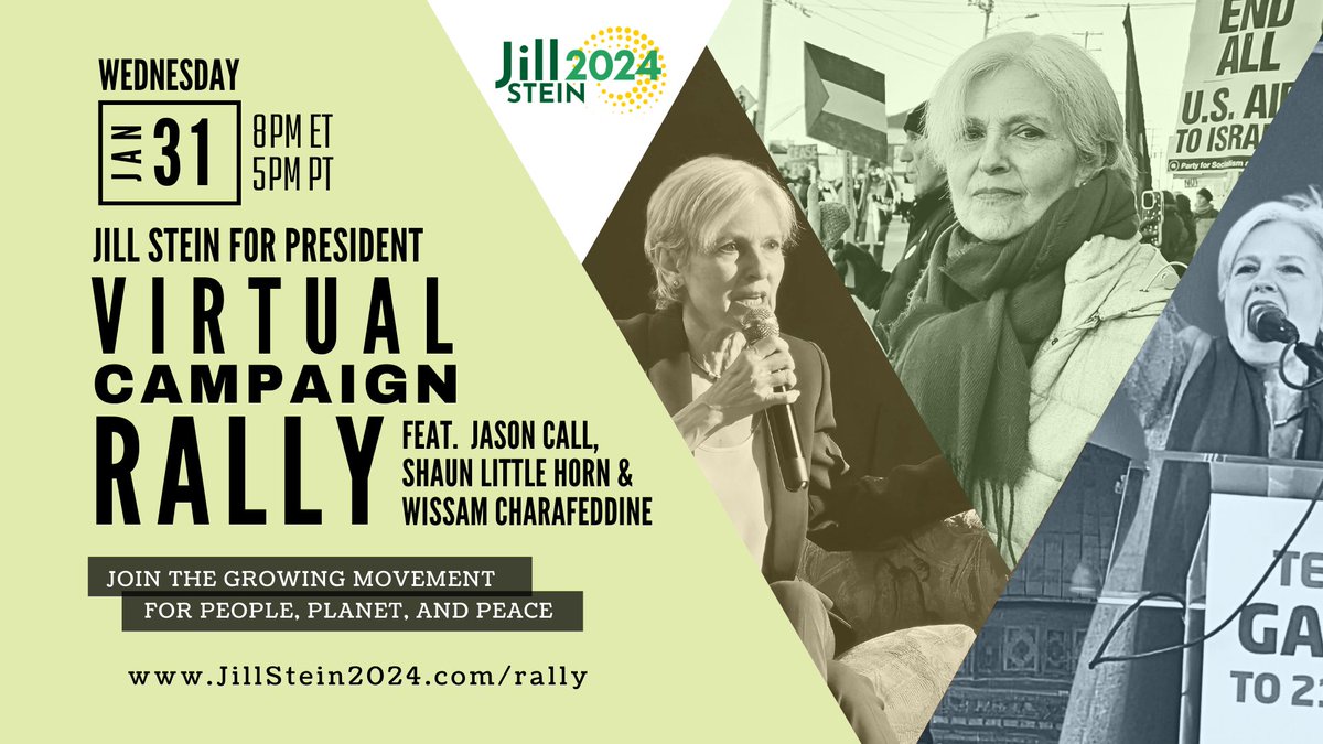 The statement is a political campaign message promoting a candidate's platform and inviting people to join a virtual campaign rally. It presents a stance against war and economic inequality, advocating for a future that benefits working people and children. The image supports the statement by advertising the event with the date, time, and featured speakers. The website link provides a resource for more information.