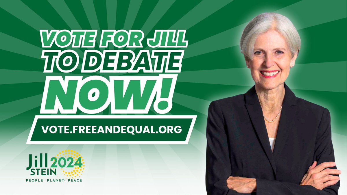 The statement is a call to action for support in a political campaign, specifically to vote for a candidate to be included in a debate. It promotes a pro-worker, anti-war, and climate action agenda and encourages participation in the democratic process. The image shows a promotional graphic for a candidate named Jill Stein, encouraging people to vote for her to be included in a debate. The website mentioned appears to be a voting platform powered by blockchain technology.