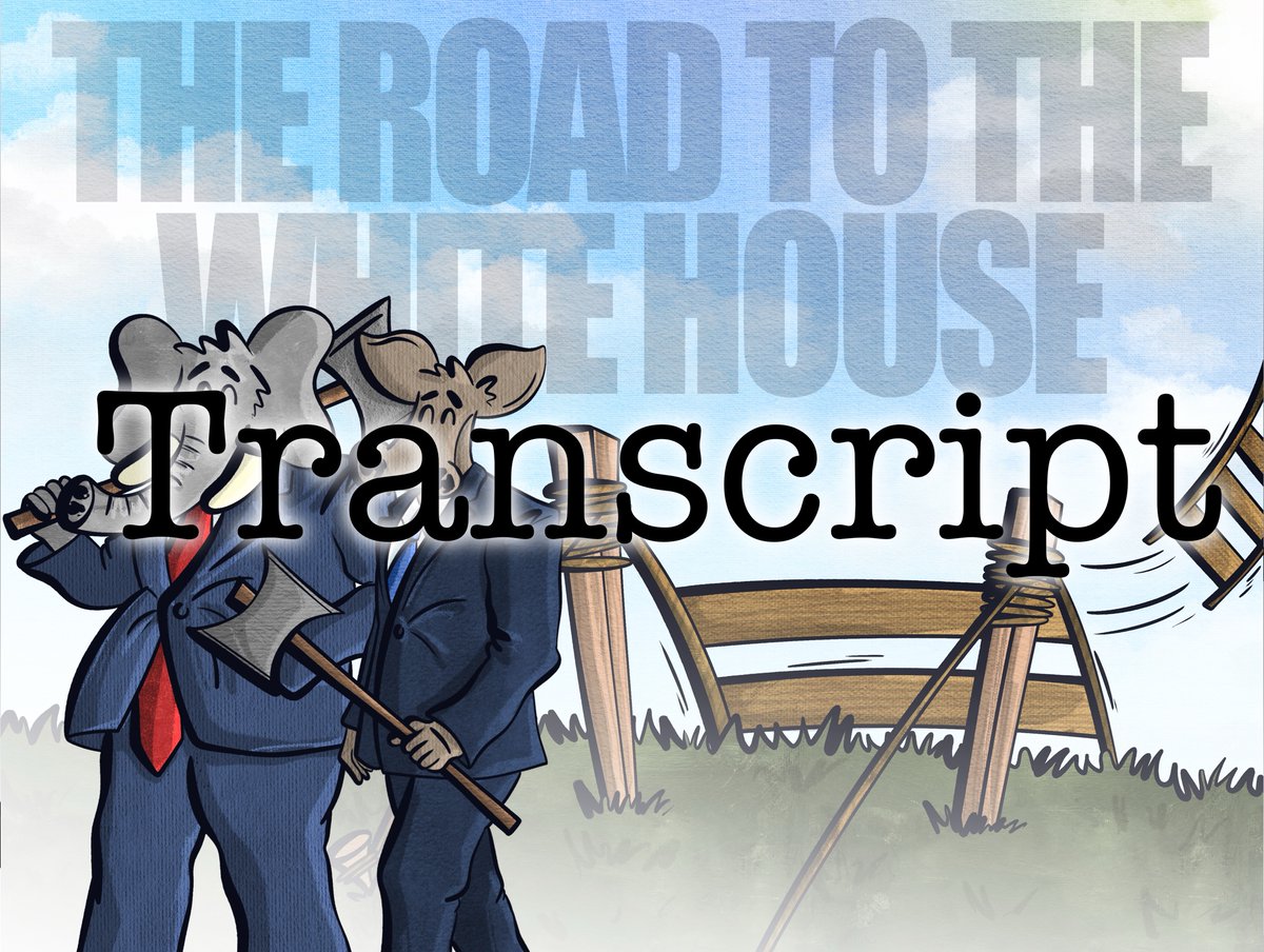 The statement from the transcript of 'America This Week, Episode 74' discusses the topic of 'lawfare' targeting various political entities and individuals. The tone seems to be critical of the legal challenges faced by these groups. The mention of 'The Lottery' by Shirley Jackson could imply a comparison between the story's themes and current political events. The image accompanying the transcript depicts anthropomorphic representations of an elephant and a donkey, common symbols for the Republican and Democratic parties in the United States, holding tools that could be interpreted as weapons, which might symbolize political combat or competition.