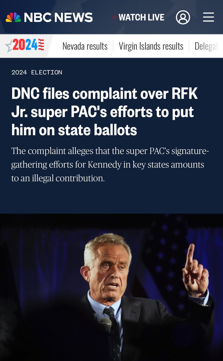 The statement 'The Game. Why are the parties so resistant to any alternatives? To opening up primaries?' appears to be a critical inquiry into the political process, questioning the resistance of political parties to alternative methods and the opening up of primary elections. The tone is inquisitive and possibly frustrated, aiming to provoke thought and discussion about the current political system. The image provided shows a news article about a complaint filed by the DNC over a super PAC's efforts to get a candidate on state ballots, which is related to the topic of the statement.