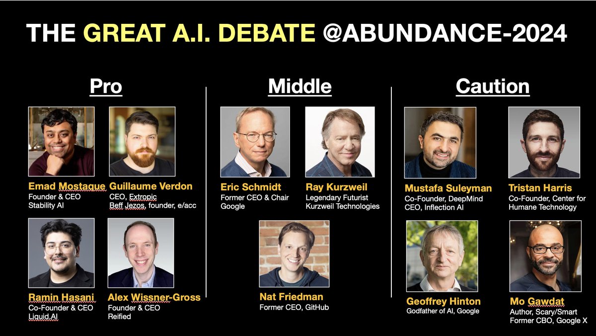 The statement is promotional in nature, advertising an event called the Great AI Debate. It expresses enthusiasm about the event and encourages participation. The image provides information about the speakers and their respective stances on AI, categorized as 'Pro,' 'Middle,' and 'Caution.' The website link offers additional context about the event's organizer, Peter Diamandis, and his coaching program, Abundance360.
