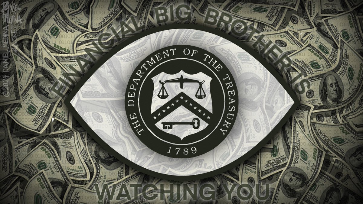 The statement 'Listen to This Article: Financial Big Brother is Watching You' accompanied by the image of a modified seal of the Department of the Treasury over a background of dollar bills suggests a critical perspective on financial surveillance or monitoring by government authorities. The tone appears to be cautionary or critical, and the intent is to draw attention to concerns about privacy and oversight in financial matters. The content implies that the government, likened to 'Big Brother' from George Orwell's '1984', is intrusively observing financial activities of individuals.