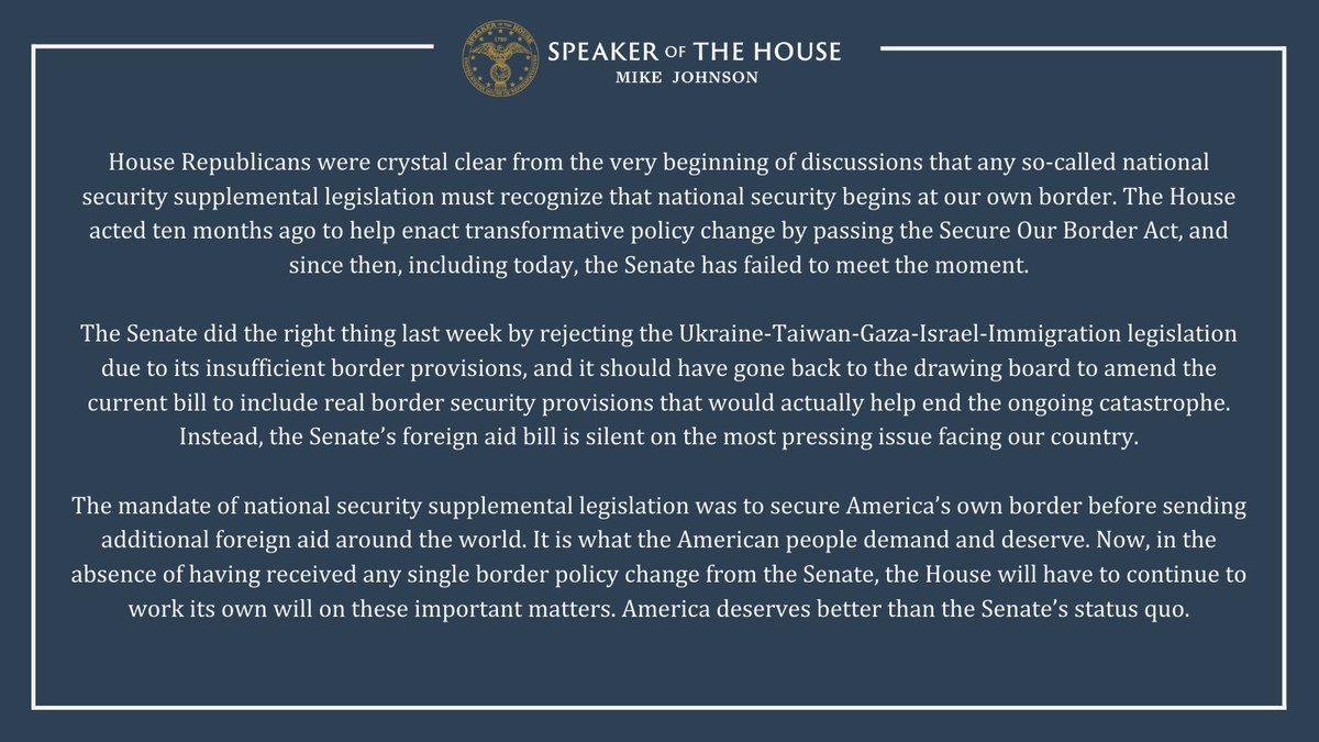 The statement is a critique of the Senate's handling of national security supplemental legislation, emphasizing the importance of border security and criticizing the Senate for not addressing what the author perceives as the most pressing issue facing the country. The tone is critical and the intent is to express dissatisfaction with legislative actions and to advocate for a different legislative focus.