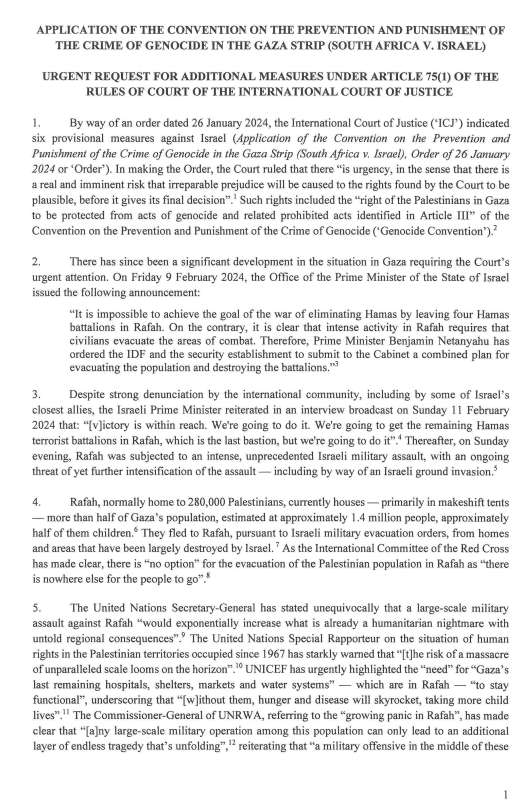 The statement is a news report detailing an urgent request by South Africa to the International Court of Justice (ICJ) regarding the situation in Rafah and the application of the Convention on the Prevention and Punishment of the Crime of Genocide. The tone is formal and informative, providing an update on legal proceedings and developments in an international conflict. The content includes excerpts from the request and references to statements by international figures and entities.