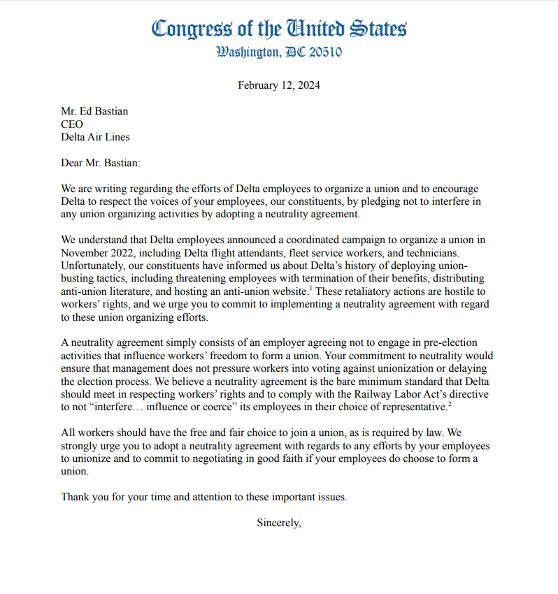 The statement is a formal letter addressed to the CEO of Delta Airlines from members of the Labor Caucus. It discusses the importance of workers' rights to organize and form unions without interference from their employer. The letter calls for Delta Airlines to adopt a neutrality agreement to respect its employees' right to organize, citing legal requirements and ethical considerations.