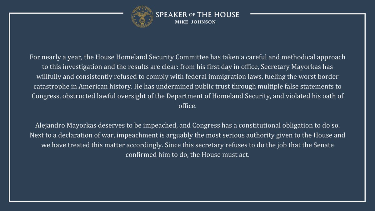 The statement is a formal position on the impeachment of a public official, focusing on the official's professional conduct and the actions of the House Homeland Security Committee. It calls for impeachment based on the committee's findings.