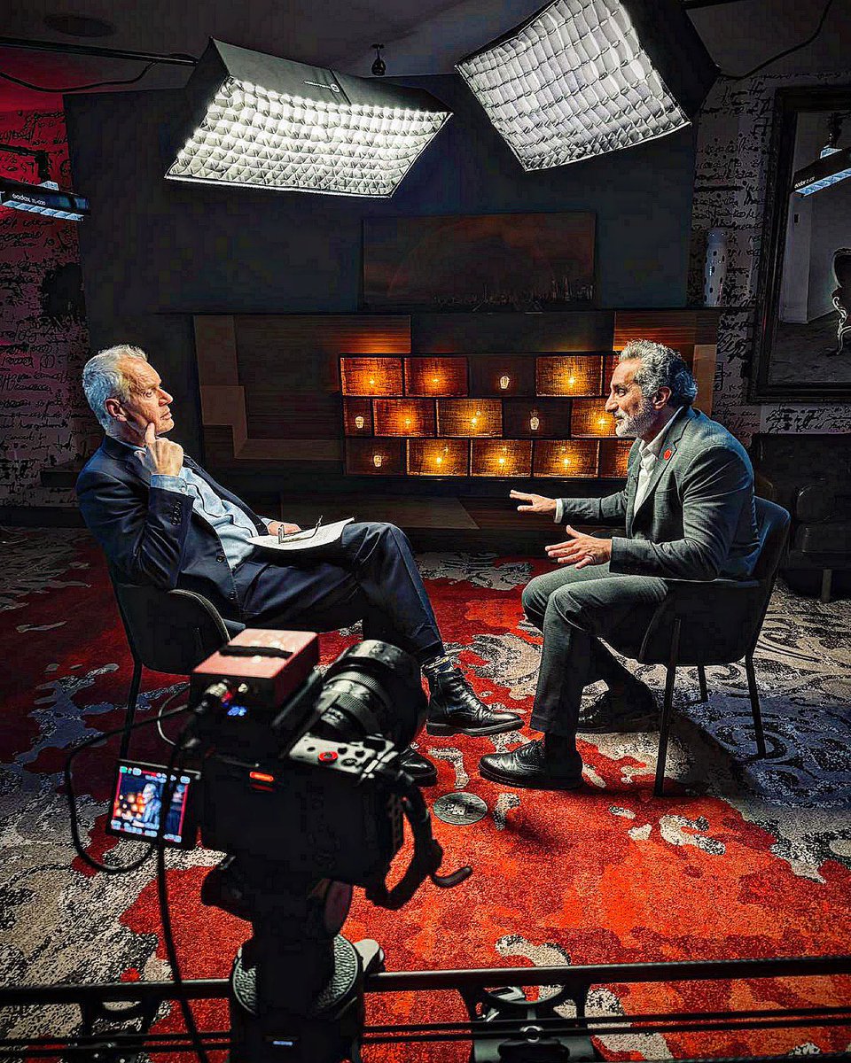 The statement is a positive and promotional message about an interview that took place on a show. It expresses satisfaction with the conversation and invites others to watch the episode. The image shows two individuals engaged in what appears to be a television interview setting. The accompanying link provides access to the interview, suggesting that the content is available for public viewing. The tone is appreciative and informative, with no indication of harm, disrespect, or lack of empathy.