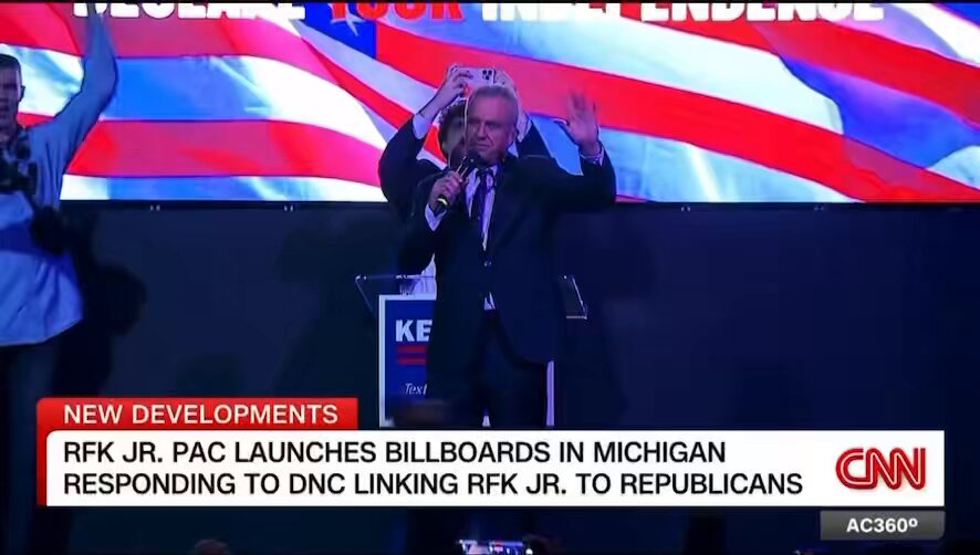 The conversation appears to be a supportive and positive exchange between a user and a public figure, Robert Kennedy Jr., regarding social and political issues. The user @blacks4kennedy expresses support for Kennedy's dedication to fighting for marginalized groups and suggests a shared mission to address the struggles of Black Americans. The reply 'Let’s do it! 🇺🇸' is an enthusiastic endorsement of the sentiment expressed by @blacks4kennedy. The image shows a news segment about RFK Jr. with a caption about political activities, which seems to be related to the conversation but does not directly influence the analysis of the text.