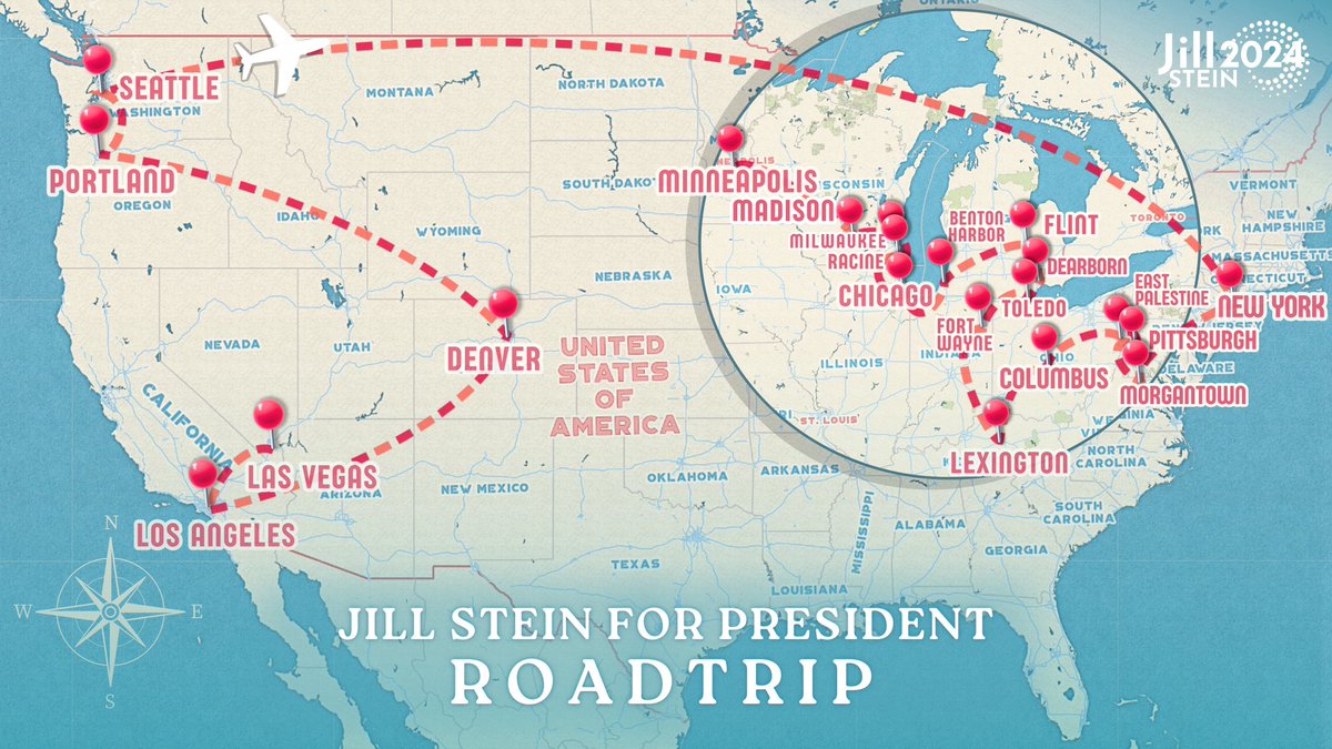The statement is a political campaign message promoting a series of events for a candidate, Jill Stein. It outlines the candidate's platform, which is described as pro-worker, anti-war, and pro-climate action, and invites people to participate in campaign events. The tone is positive and mobilizing, aiming to engage potential supporters. The image is a map showing the campaign trail with marked stops, which visually supports the message of the campaign tour. The website provides additional details about the campaign events and the candidate's platform.