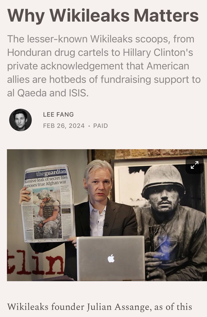 The statement presents an opinion on the significance of the Julian Assange case, highlighting its potential implications for journalists and acknowledging the contributions of Wikileaks to public knowledge. The tone is informative and seems aimed at fostering discussion on matters of public interest and journalistic freedom. The image shows a person holding a newspaper, which appears to be related to the content of the statement, providing a visual context for the discussion about Wikileaks and its impact.