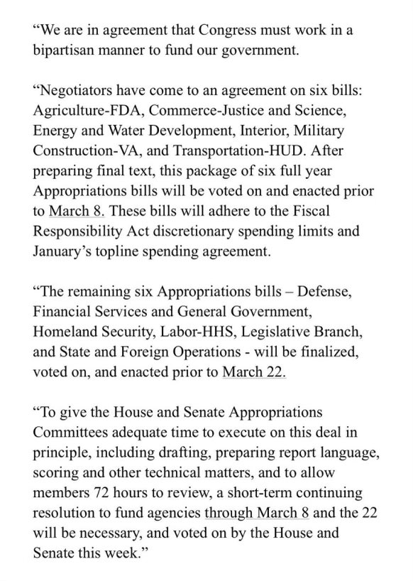 The statement is a formal and informative announcement about the bipartisan agreement on appropriations bills in the U.S. Congress, outlining the process and timeline for legislation.