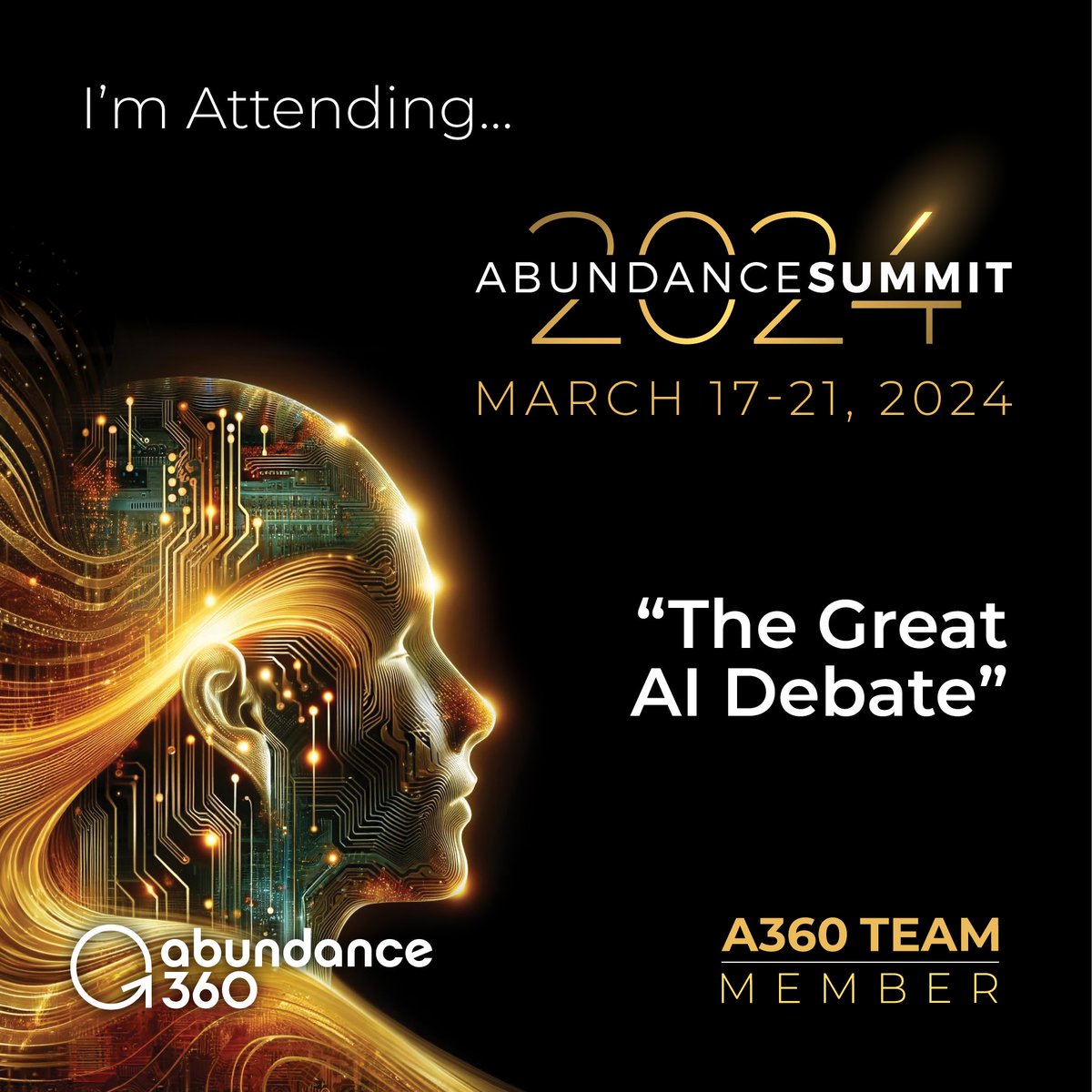 The statement is promotional in nature, expressing enthusiasm for an upcoming event called The Great AI Debate at the Abundance Summit 2024. It is an invitation and a welcome message to members and faculty, both human and AI, indicating inclusivity. The tone is positive and anticipatory. The accompanying image shows a graphic representation of a human profile intertwined with digital circuitry, symbolizing the integration of AI and human intelligence, which is relevant to the theme of the event.