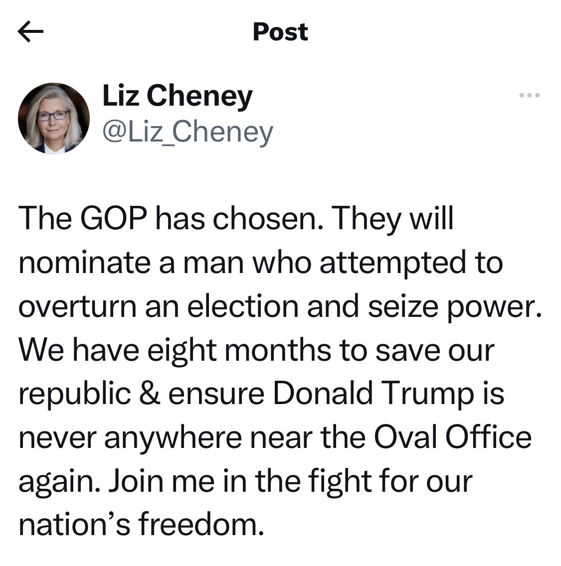 The statement by Liz Cheney constitutes public discourse as it engages in a substantive discussion about political choices and their implications for democracy. It addresses the issue of a political party's nomination process and its potential impact on the governance and democratic integrity of the country.