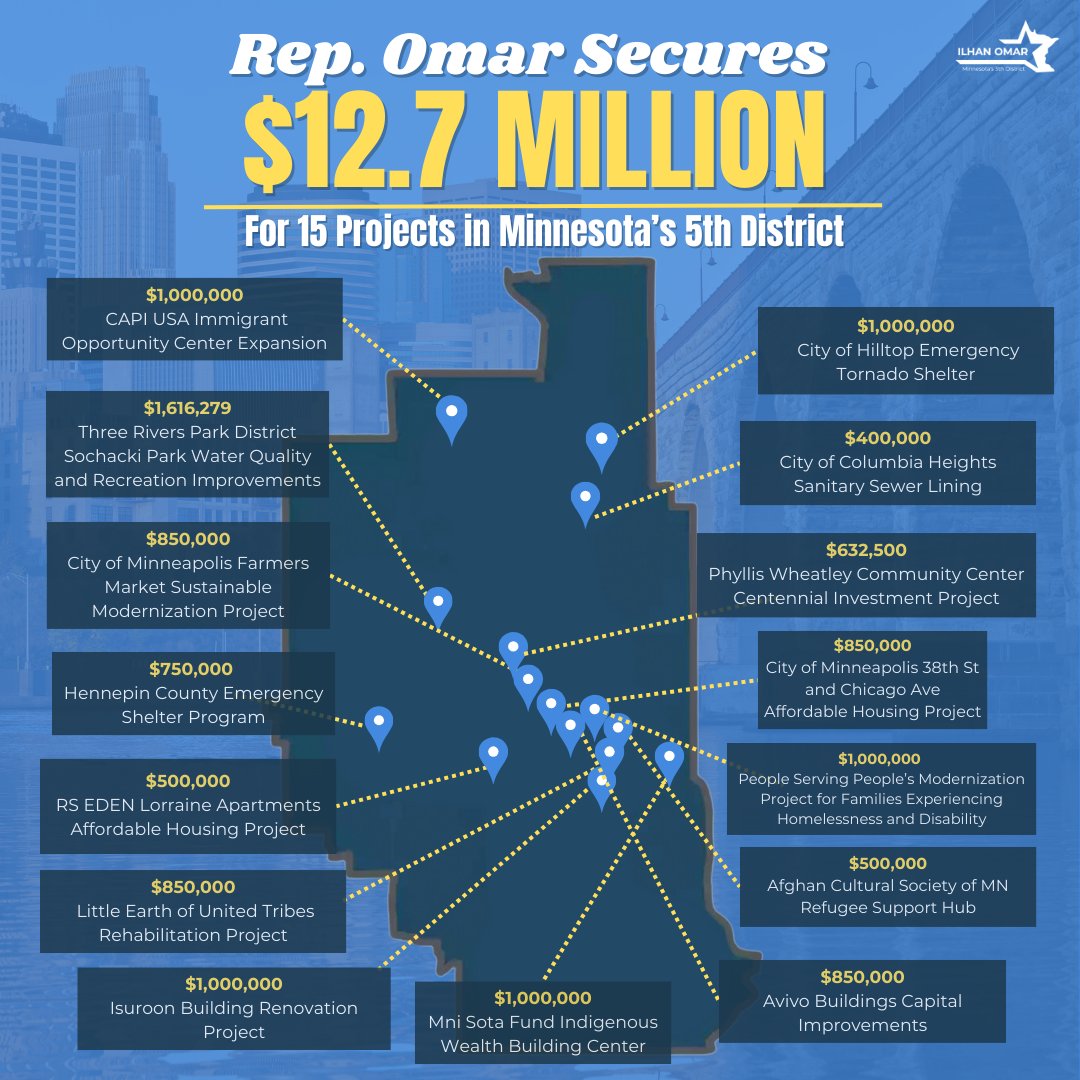 The statement is informative and celebratory in tone, announcing the securing of funds for community projects. It outlines the intended benefits for the residents, such as addressing affordable housing, climate resilience, food access, workforce development, and healthcare.