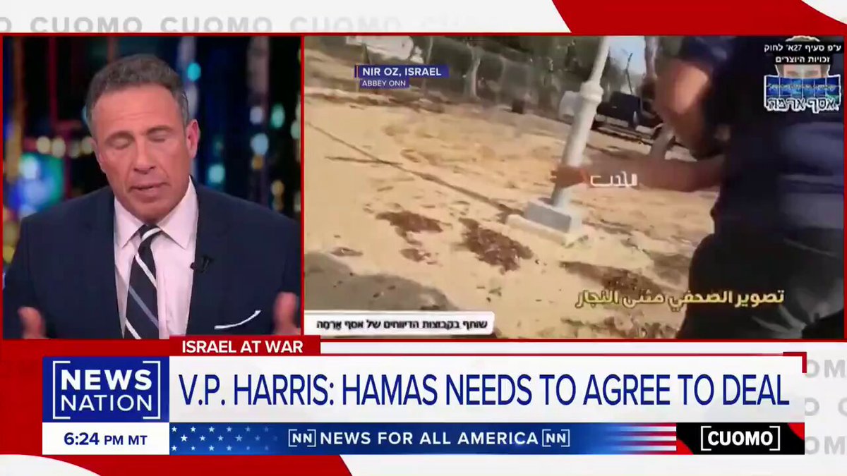 The statement presents a highly charged and controversial viewpoint on the conflict involving Hamas and the 'Free Palestine Movement.' It accuses Hamas of using civilians as human shields and criticizes supporters of the Palestinian cause for exploiting these situations. The tone is accusatory and presents a one-sided perspective on a complex issue. The image shows a news broadcast with a split screen, one side showing a news anchor and the other displaying footage related to the conflict, which seems to be used to support the statement's narrative.