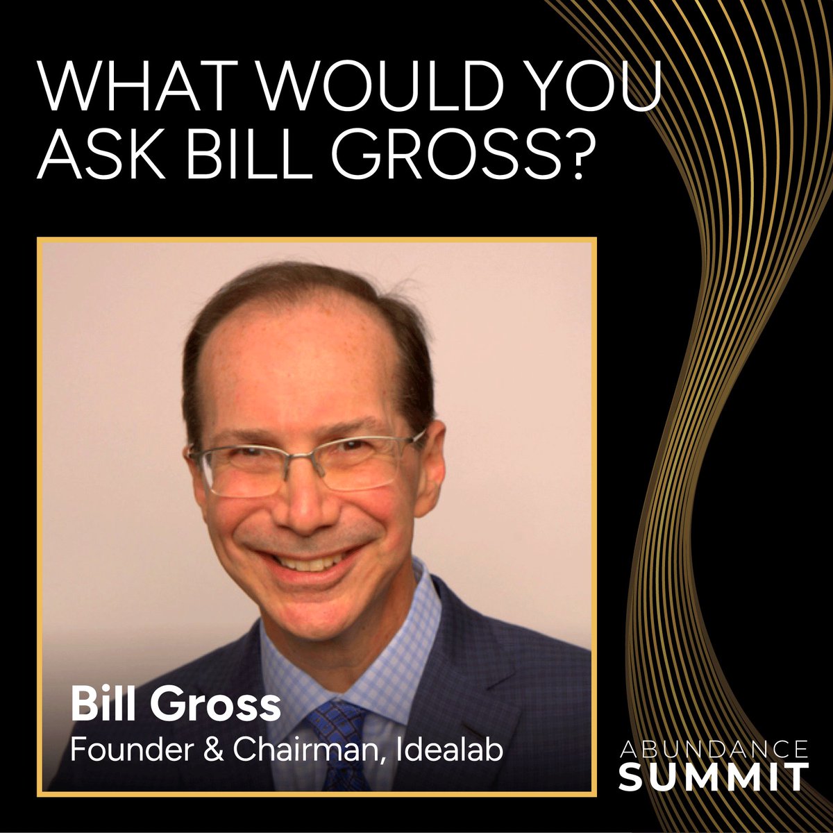 The statement is promotional in nature, inviting engagement and questions for Bill Gross in the context of the Abundance Summit. It highlights Bill Gross's achievements and his role as the founder of Idealab. The tone is positive and informative, and the content is relevant to the event being promoted. The image is a professional headshot of Bill Gross with text inviting questions for him, which is appropriate for the context of a summit or conference.