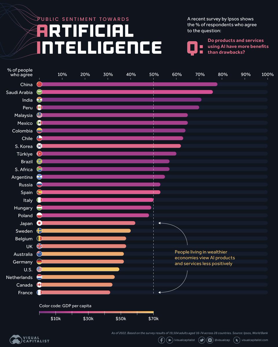 The statement questions the presence of 'doomers' in France and criticizes the lack of evidence for a causal claim made in a third paragraph, which is not provided in the context. The tone appears to be skeptical and seeks clarification or evidence for the claims made. The statement is part of a conversation about public sentiment towards artificial intelligence, with the image providing data on this sentiment across various countries.
