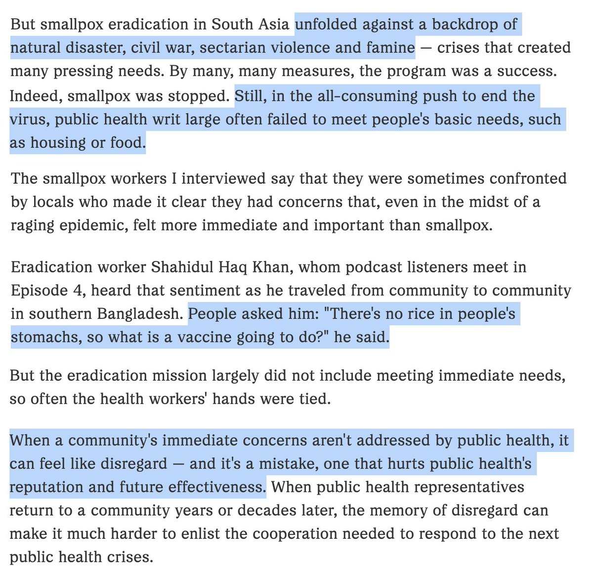 The statement is a critical reflection on the importance of addressing basic needs in the context of public health initiatives. It suggests that neglecting such needs can undermine trust in public health and its future effectiveness. The tone is analytical and concerned with the implications of public health strategies.