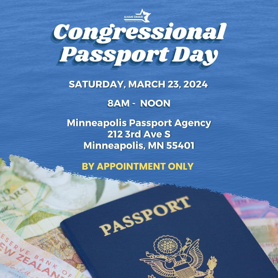 The statement is a public service announcement informing citizens of a Congressional Passport Day event, providing logistical details and a link to sign up for an appointment.