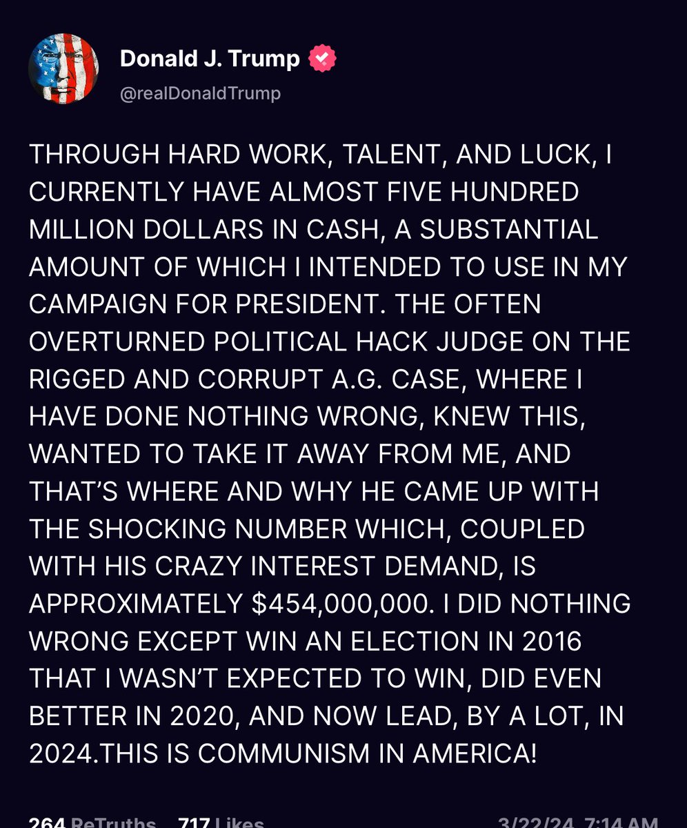 The statement is critical of certain legal and political figures, and it makes claims about the author's financial status and intentions regarding political campaigning. It also includes a broad political claim about the nature of the American system.