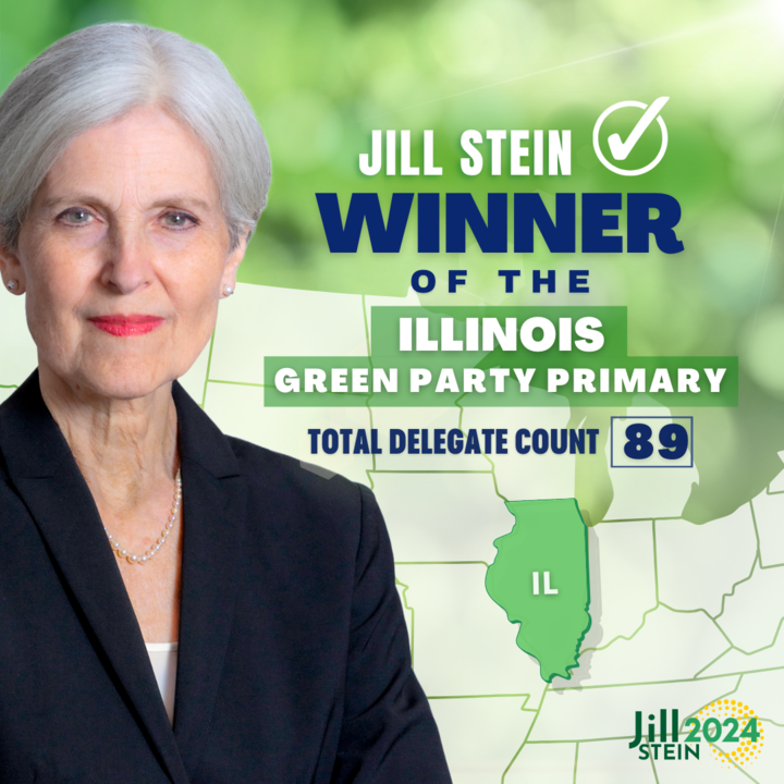 The statement is a factual announcement of primary election results for the Green Party, indicating a win for the candidate and the number of delegates secured.