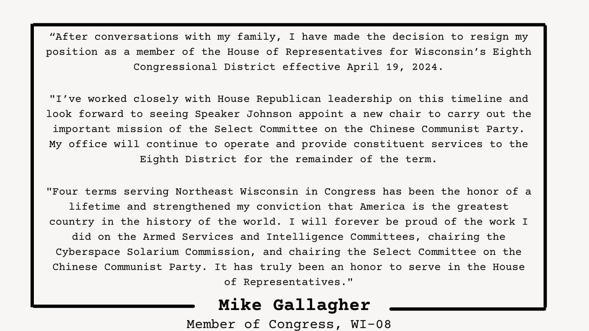 The statement praises Congressman Mike Gallagher for his service and highlights his work related to national security, specifically concerning the threat posed by Beijing to the U.S. It also mentions his role as Chairman of the Select Committee, which is a position of oversight and policy-making in the U.S. House of Representatives.