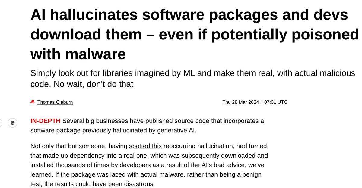 The statement is a headline from a news article discussing the risks associated with AI-generated software packages that may contain malware. The tone is cautionary, and the intent is to inform readers about a potential cybersecurity issue. The content addresses the phenomenon of AI 'hallucinating' software packages, which developers might inadvertently use, leading to security risks.
