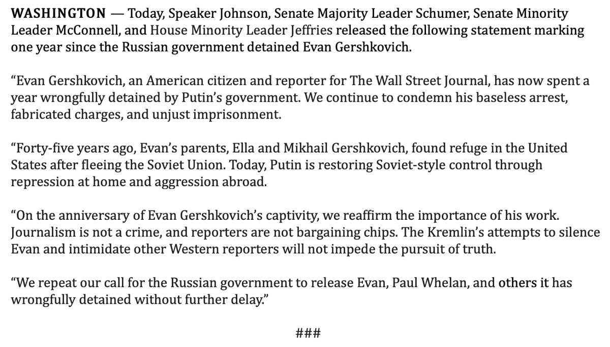 The statement is a serious and condemnatory call to action regarding the wrongful detention of a journalist, advocating for his release and the importance of press freedom.
