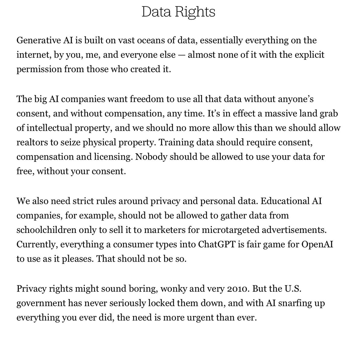 The statement is a call to action for the protection of data rights in the AI industry, advocating for consent, compensation, and stricter privacy rules.