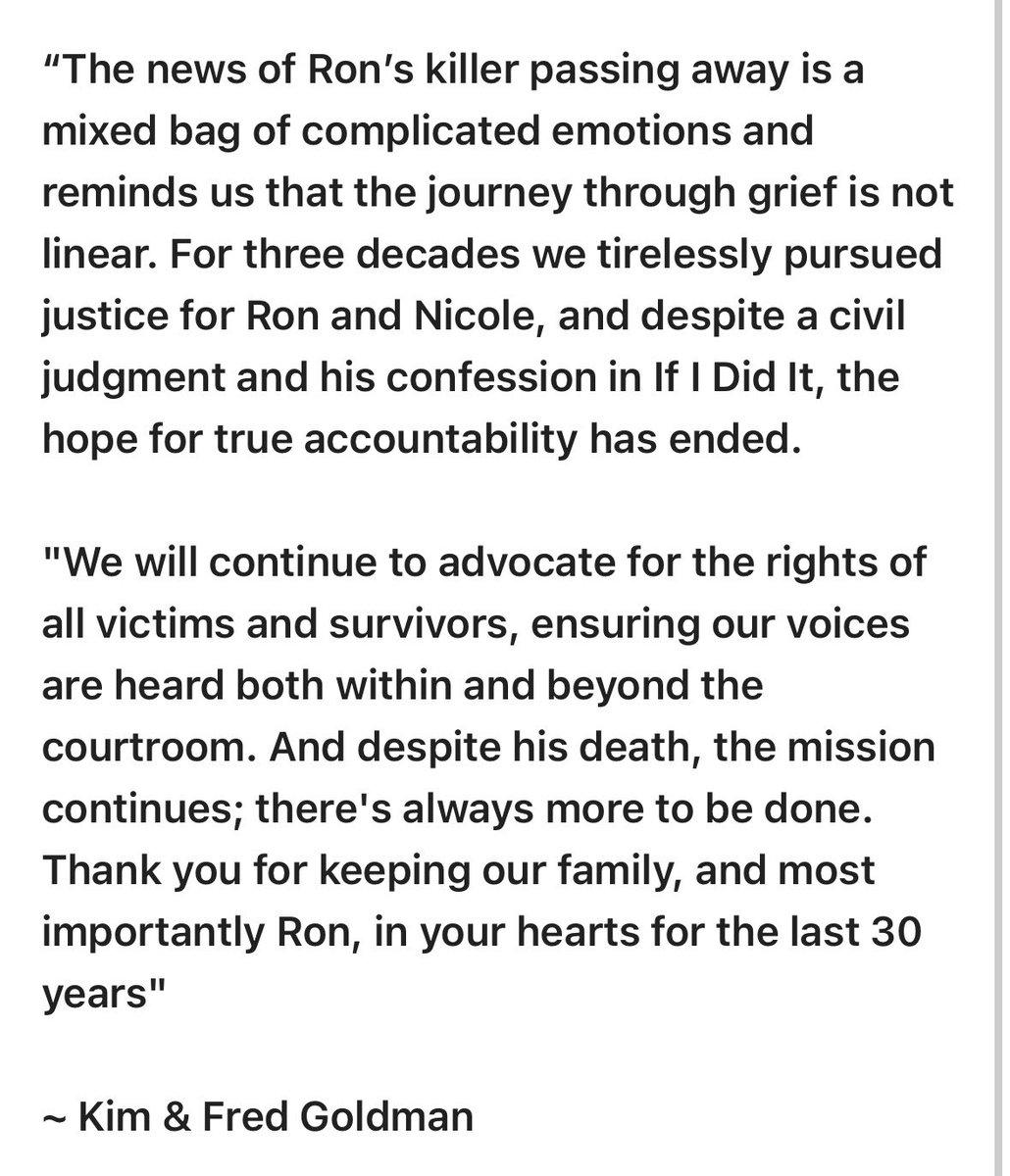 The statement from Kim and Fred Goldman addresses the emotional and legal aftermath of Ron Goldman's death, reflecting on the complexities of grief and the pursuit of justice. It emphasizes continued advocacy for victims' rights and expresses gratitude to those who have supported their family.