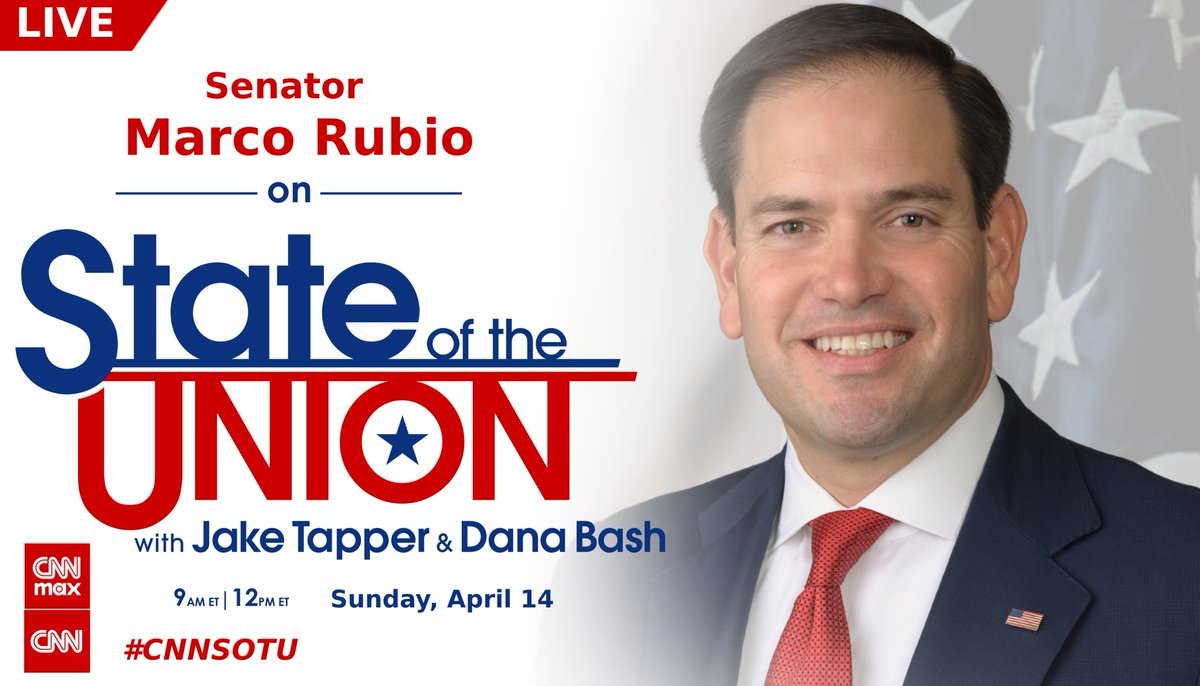 The statement is a promotional announcement for a television program featuring a public figure, Senator Marco Rubio, on CNN's 'State of the Union' with Jake Tapper. It serves to inform the audience about the upcoming broadcast and provides multiple platforms where the show can be accessed. The tone is informative and neutral, aiming to reach a broad audience. The content does not engage in substantive engagement with public issues or policies but rather promotes viewership of a program that may discuss such topics.