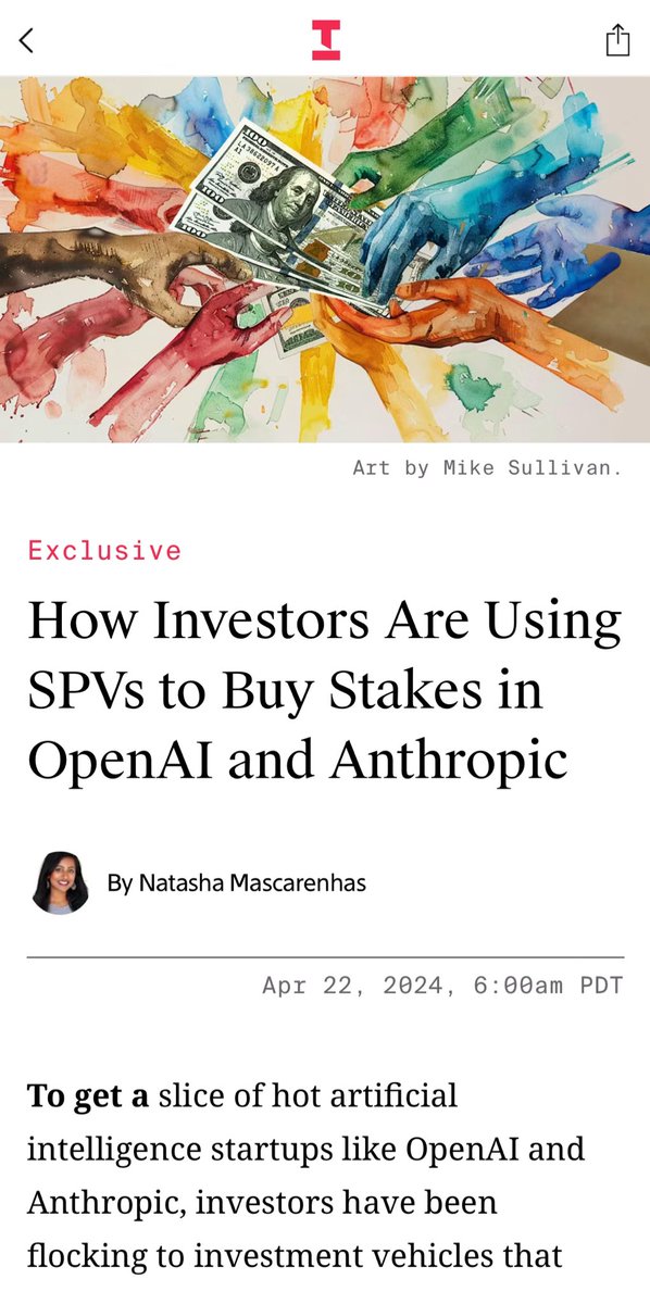 The statement provided is a link to an article discussing how investors are using SPVs to buy stakes in companies like OpenAI and Anthropic. This is a form of public discourse as it engages with the topic of investment strategies in the tech industry, which is a public issue. The conversation it replies to, posed by Gary Marcus, questions the wisdom of these investment strategies based on past experiences with SPACs, adding a critical perspective to the discussion.
