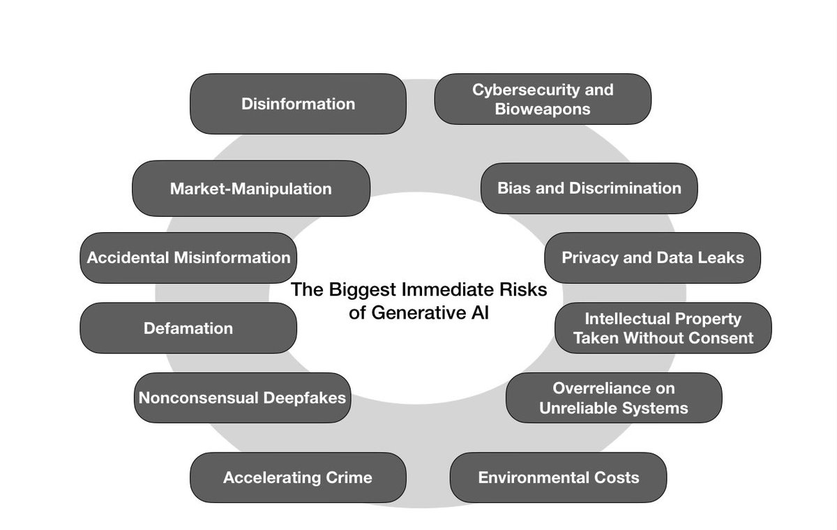 The statement 'update: i have gone with the elegant simplicity suggested by @gavitron100' is a response in a conversation about improving the visual presentation of an infographic related to the risks of generative AI. The statement itself does not engage in substantive public discourse as it primarily addresses a specific action taken in response to a design suggestion, rather than discussing the broader societal issues or policies depicted in the infographic.