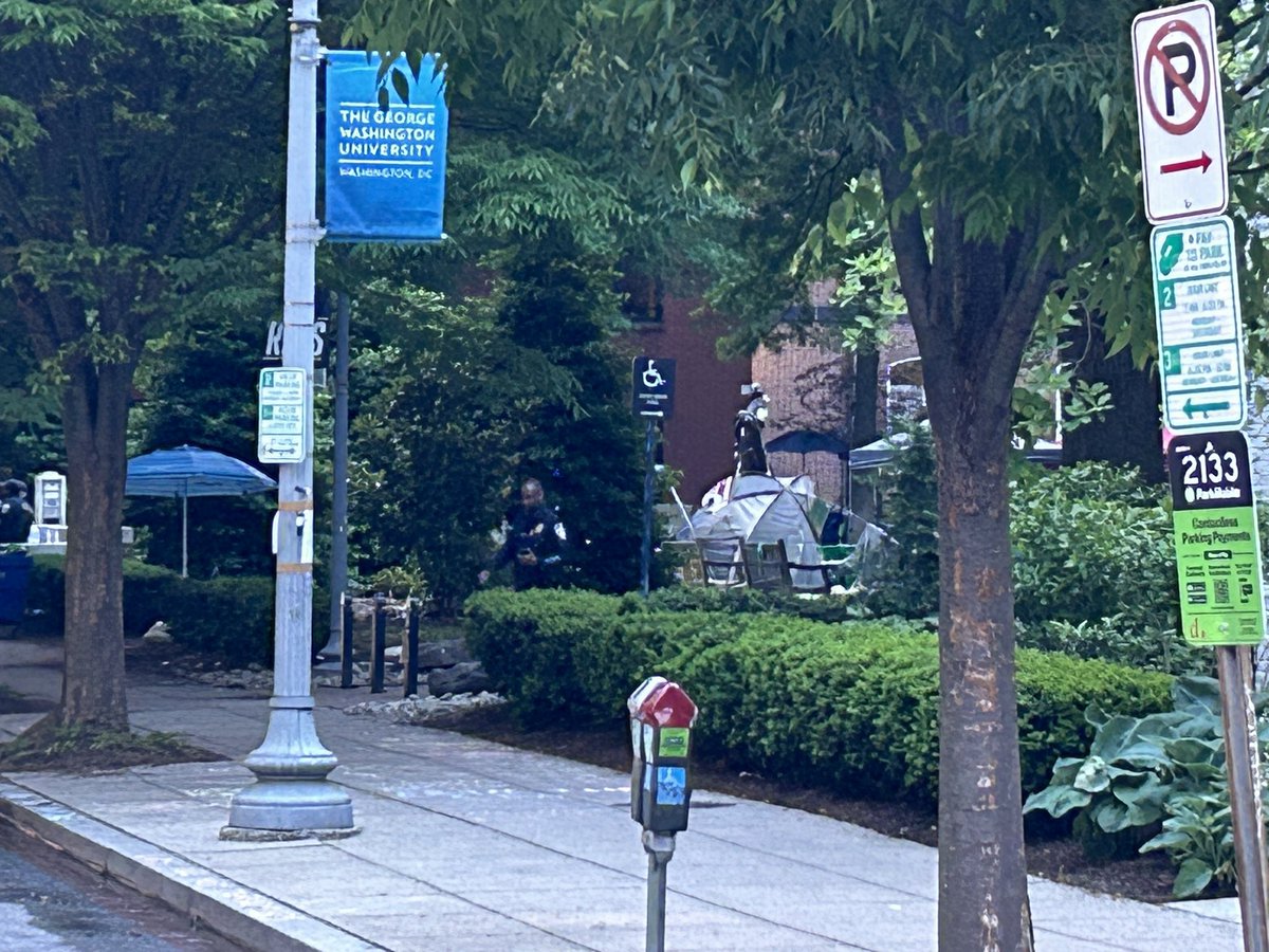The statement reports on the removal of Kufiya and Palestinian flags from a statue of George Washington after a police action to clear an encampment. This statement touches upon issues of public demonstration, police action, and potentially the expression of political or cultural identities.