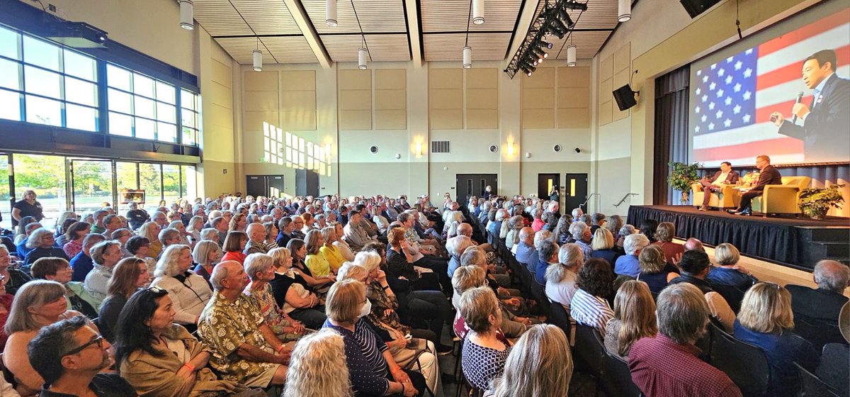 The statement 'Great speaking to the people of Sonoma tonight about how to improve our future. 🚀🇺🇸' accompanied by an image of a speaker addressing a large audience in a hall, reflects a public engagement event focused on discussing future improvements for the community. The statement and image together suggest a positive and inclusive approach to civic engagement.