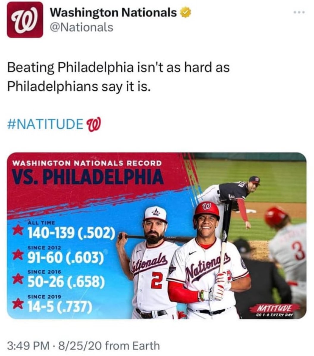 The statement 'The Phillies are 47-19 against this 🤡 organization since this tweet.' is a response to a previous tweet by the Washington Nationals boasting about their record against the Philadelphia Phillies. The tone of the statement is mocking and intended to highlight the Phillies' success against the Nationals since the original tweet. The use of the clown emoji (🤡) is derogatory and intended to belittle the Nationals organization. This statement does not engage in substantive public discourse but rather in sports banter and rivalry.