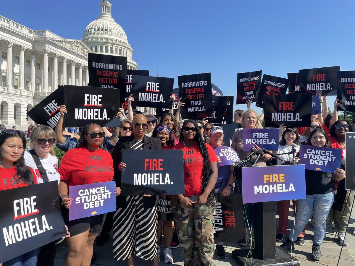 The statement and accompanying image constitute public discourse as they address a public issue related to student debt and the performance of MOHELA, a student loan servicer. The tone is assertive and calls for action from the Department of Education to fire MOHELA. The intent is to advocate for change in student loan servicing to better serve borrowers.