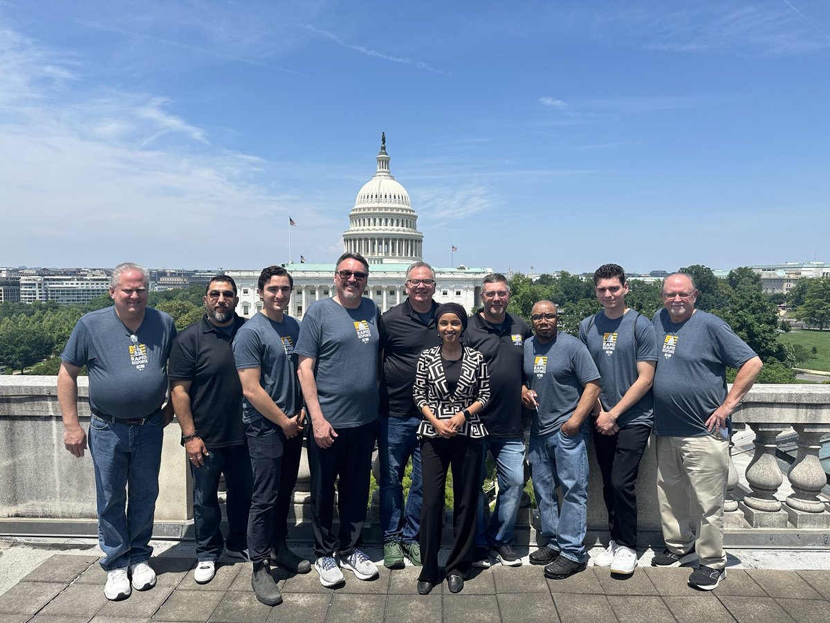 The statement expresses a positive sentiment towards the United Steelworkers union and highlights the importance of their role in advocating for labor policies. The accompanying image shows a group of people, presumably the representatives mentioned, standing together in front of a recognizable landmark, which adds context and visual support to the statement.