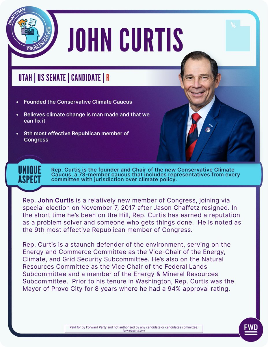The statement and accompanying image promote a political candidate, John Curtis, for the U.S. Senate in Utah. It highlights his bipartisan approach and his work on climate change, positioning him as a problem solver. The tone is positive and promotional, aiming to garner support for the candidate.