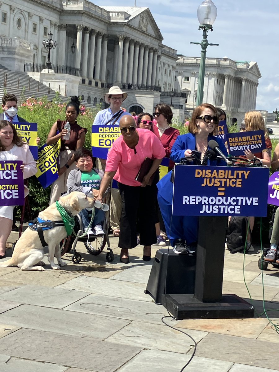 The statement highlights a positive moment during a public event focused on disability and reproductive justice. It mentions a service dog being given a drink by a public figure, which adds a humanizing and compassionate element to the event. The image supports the statement by showing a diverse group of people advocating for important social issues.