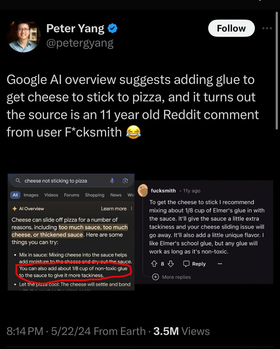 The statement and the accompanying image engage in a lighthearted critique of AI's reliance on potentially unreliable sources, using humor to highlight the absurdity of an AI suggesting the use of glue in pizza based on an old Reddit comment. The statement also touches on the value and significance of social media data, albeit in a sarcastic manner.
