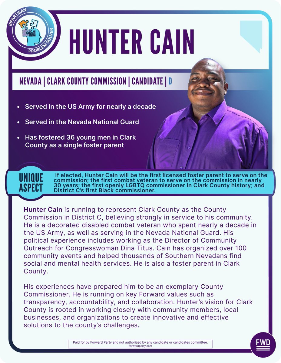 The statement and accompanying image promote Hunter Cain as a candidate for the Clark County Commission, highlighting his military service, foster parenting, and commitment to community service. The tone is positive and supportive, aiming to garner bipartisan support for his candidacy.