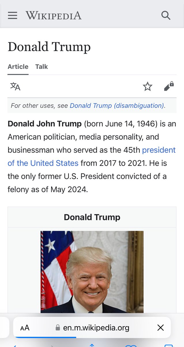 The statement criticizes the Wikipedia entry for Donald Trump, suggesting that the emphasis on his felony conviction is a deliberate attempt to undermine his status as a frontrunner for the presidency. The tone is accusatory and suggests bias in the presentation of information.
