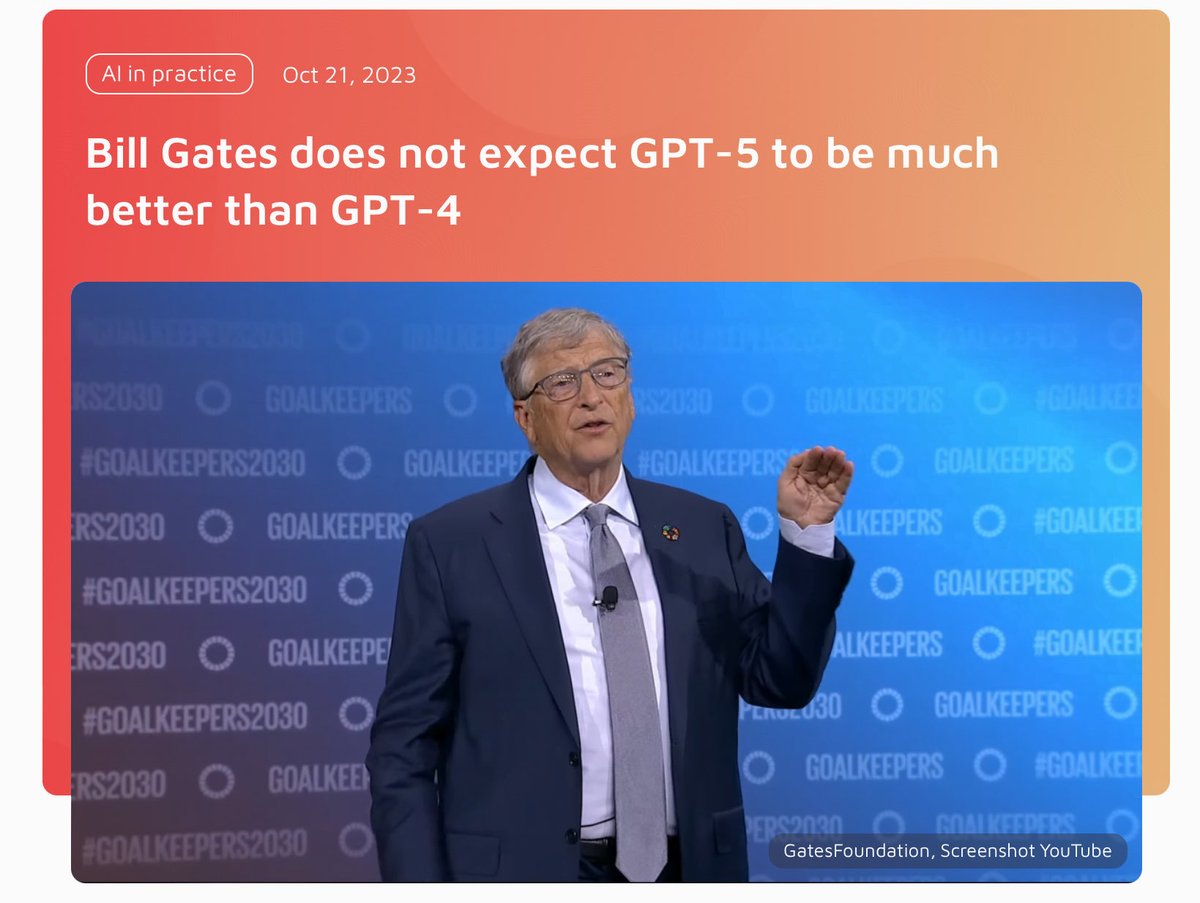 The statement and the accompanying image engage in a public discourse about the development and expectations of AI models, specifically GPT-4 and GPT-5, and Bill Gates' opinions on the matter. The conversation involves multiple public figures and discusses the implications of AI advancements, investments, and public statements made by influential individuals.